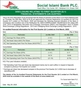 Disclosure Relating to Un-Audited Financial Statements First Quarter of Social Islami Bank PLC